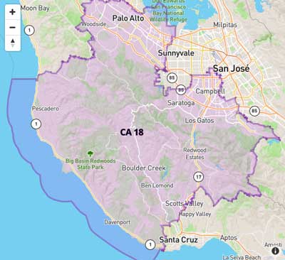 District 18: Anna Eshoo at 698 Emerson St., Palo Alto, California 94301 1450-323-2984,1-408-245-2330,1-831-335-2020